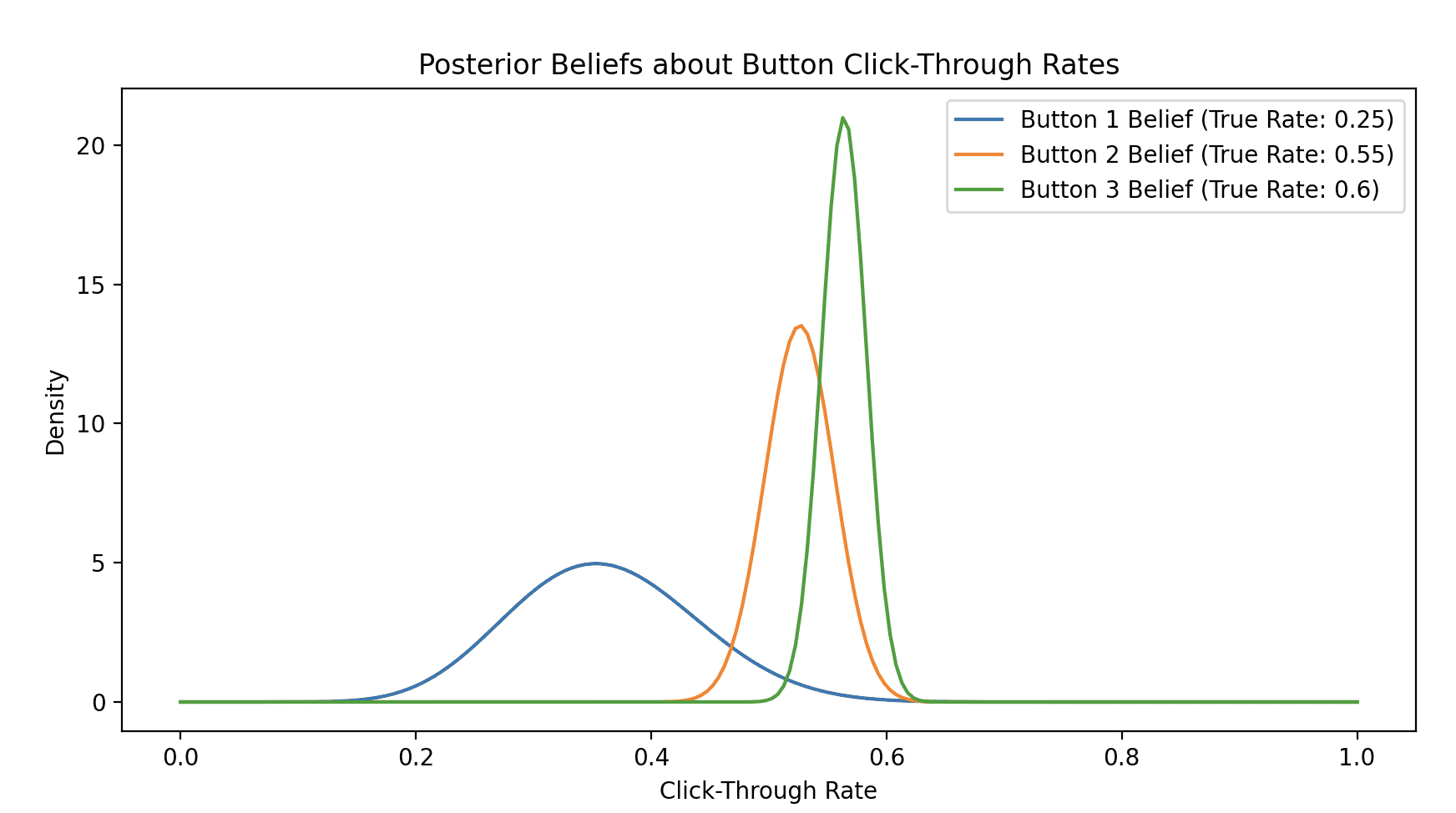 A beautiful Bayesian solution to this is Thompson Sampling. Each button’s “true” click-through rate is modeled as a probability distribution (our belief). To make a decision, we simply take one random sample from each distribution and choose the button with the highest sample. The result of that choice is then used to update the distribution. This naturally balances exploration and exploitation.